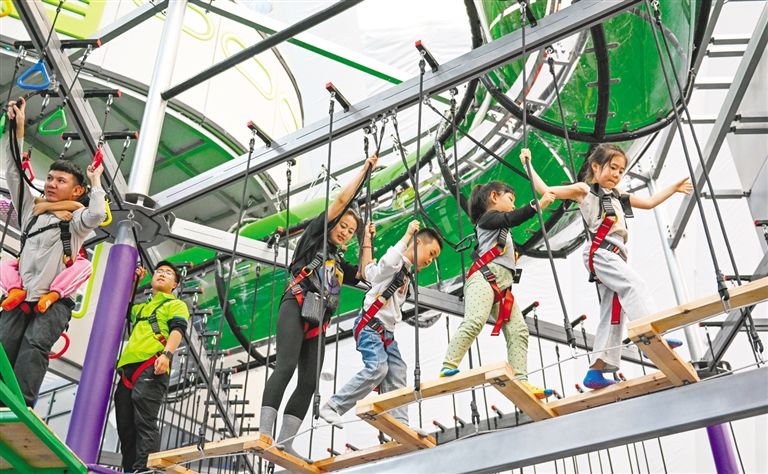 10月5日,家长陪伴孩子开心玩耍。当日,呼和浩特市大黑河军事主题公园人流如织,“逐光原野运动乐园”凭借寓教于乐的亲子游项目,吸引众多家庭前来游玩,日均接待游客近3000人,成为青城文旅活动矩阵中极具特色的亲子打卡地。草原云·正北方网记者 王磊 摄