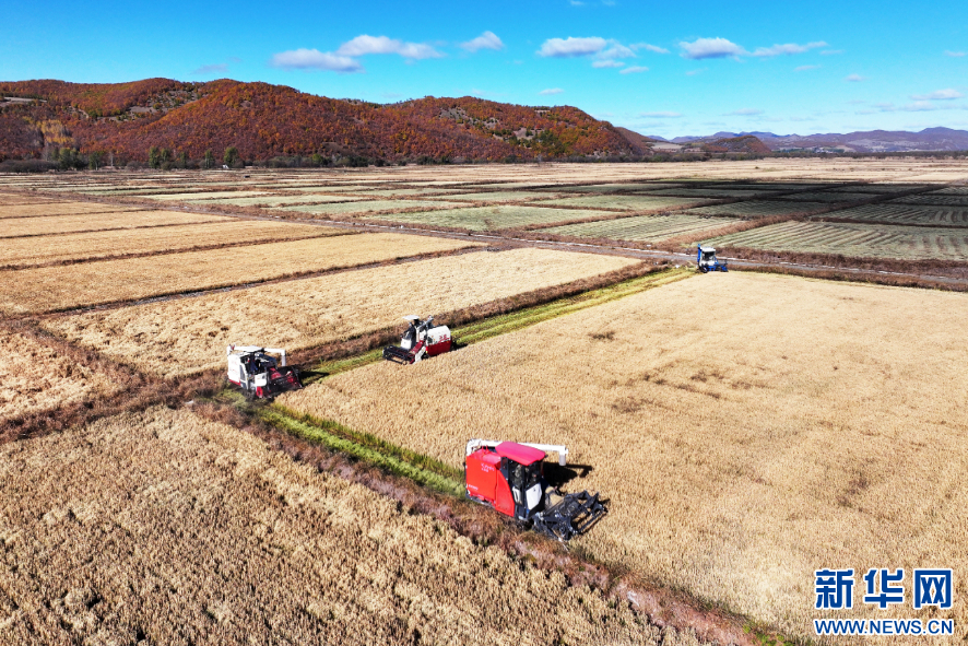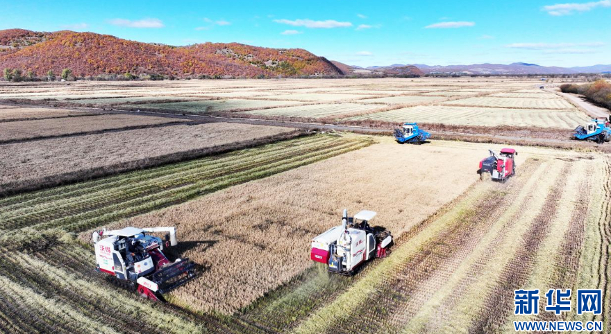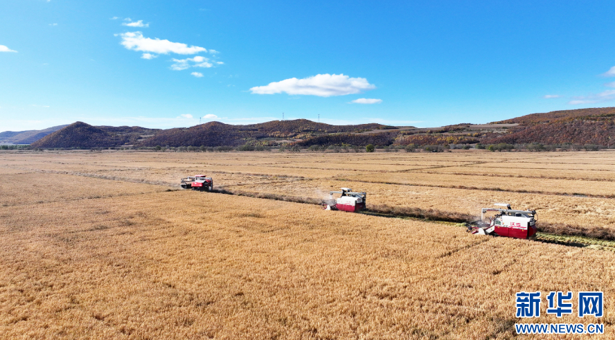 10月8日,内蒙古自治区呼伦贝尔农垦扎兰屯农牧场田间,机械化收割水稻。新华网发(韩颖群 摄)