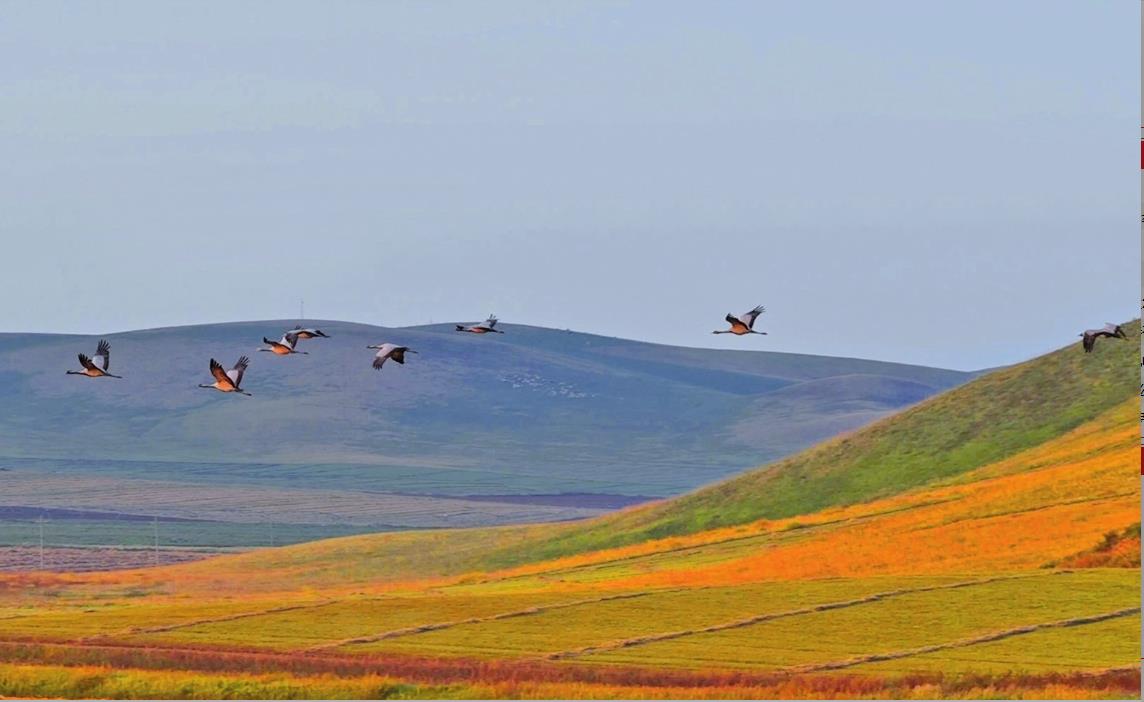 这片孕育了丰收喜悦的土地,以充足的食物和开阔的空间,成为蓑羽鹤南迁路上的“快乐驿站”。镜头里,灵动鹤影点缀田间,既是锡林浩特沃土滋养万物的生动见证,更勾勒出秋韵深处人与自然和谐共生的美好图景,尽显北疆草原的生态之美与生命活力。(珠日恨塔拉)