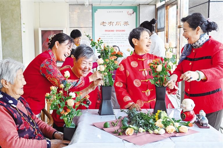 10月27日,工作人员与志愿者一同陪伴老人们插花。当日,呼和浩特市民政局联合玉泉区民政局开展的“爱心敬老 情暖重阳”主题活动在金河夕阳红康乐园举行,现场开展了制作重阳糕、体验插花等活动,在欢声笑语中弘扬尊老、敬老、爱老的中华传统美德。草原云·正北方网记者 王磊 摄