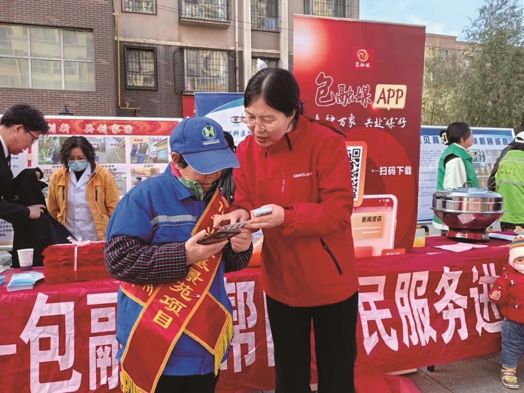 另一边,包融帮帮团服务区,人气同样“爆棚”。包头市融媒体中心的记者化身“指导员”,手把手教居民操作包融媒客户端,耐心倾听居民诉求,递上便民联系卡片。