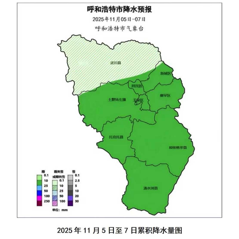 降水方面:11月5日凌晨至夜间,全市大部多云转阴,部分地区伴有间歇性零星小雨,降雨量为2毫米以内。6日白天至7日白天,全市将出现明显降水天气,中南部主要以雨为主,累积降水量7~15毫米,武川县及中部沿山一带雨转雨夹雪,降水量为3~7毫米。南部清水河县、和林格尔县降水持续至7日下午,其余地区7日上午降水逐渐结束。