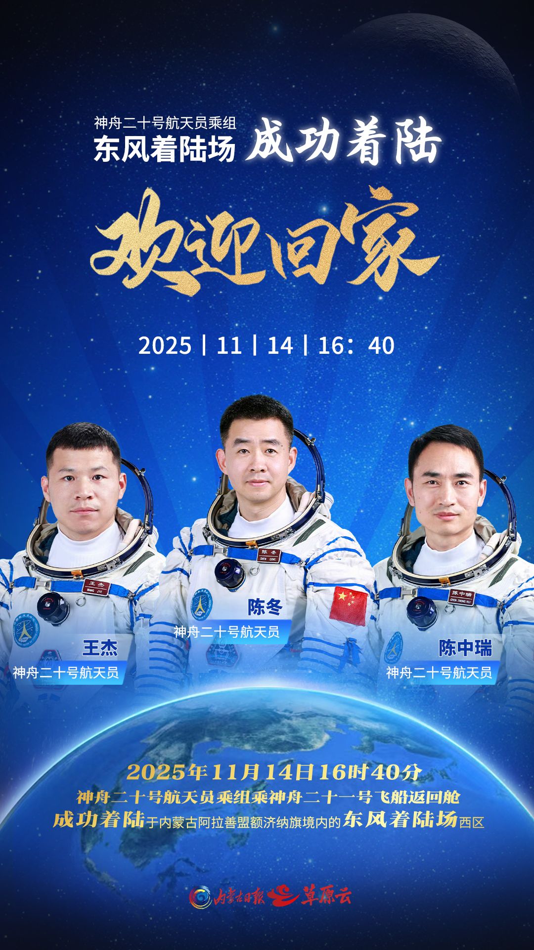 北京时间2025年11月14日16时40分,神舟二十号航天员乘组乘神舟二十一号载人飞船返回舱在东风着陆场西区成功着陆。