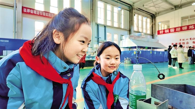 11月25日,两名学生在观察新型焊接工艺简易实验模型。当日,呼和浩特市新城区团结小学的师生走进内蒙古工业大学新城校区,开展“科技赋能促成长,实践体验悟真章”半日研学活动。师生们探访了小平科技创新团队,参观了电工电子实习中心等地,在实地观摩与DIY制作中,将课本知识与实践操作深度融合。草原云·正北方网记者 田婷 摄