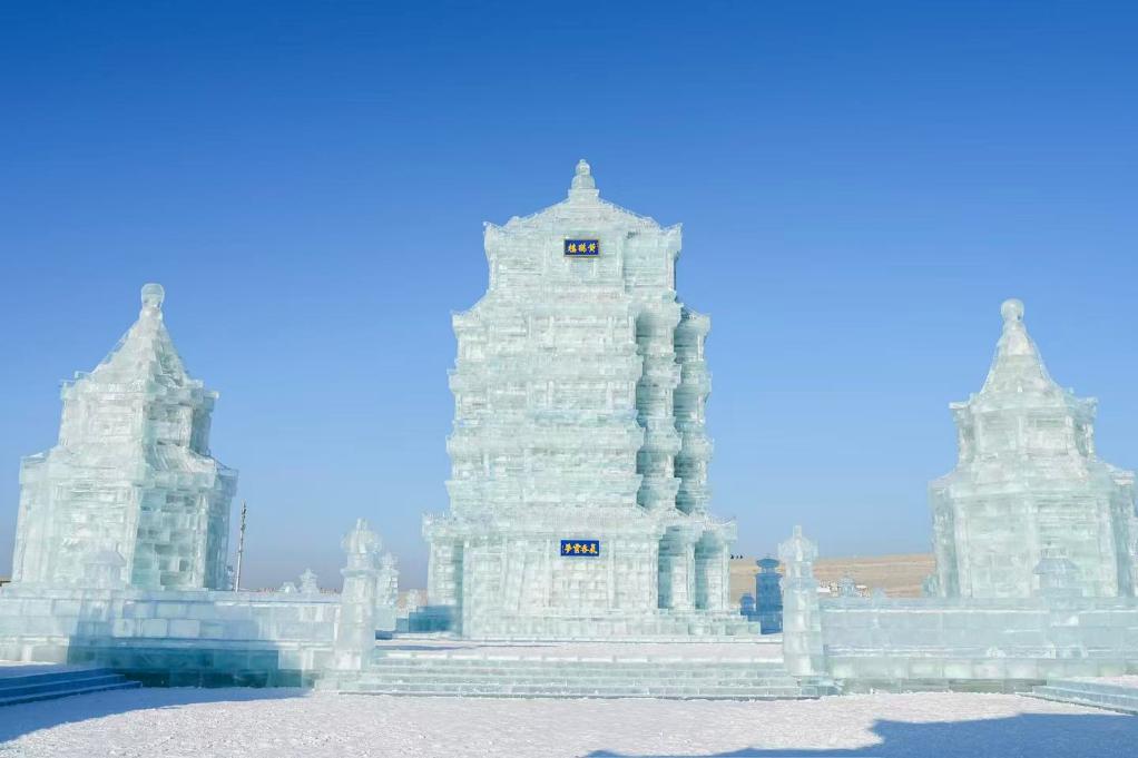 第二十七届哈尔滨冰雪大世界园区内的黄鹤楼冰建。(哈尔滨冰雪大世界供图)