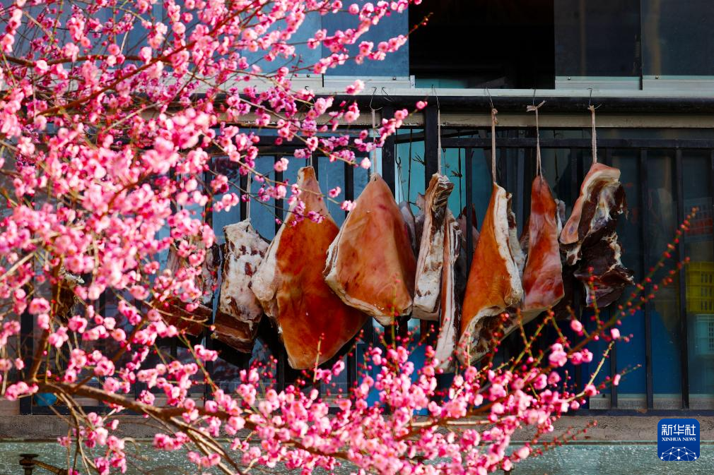 1月13日拍摄的梅花掩映着重庆市黔江区伴山国际小区居民窗口的过年腊肉。新华社发(杨敏摄)