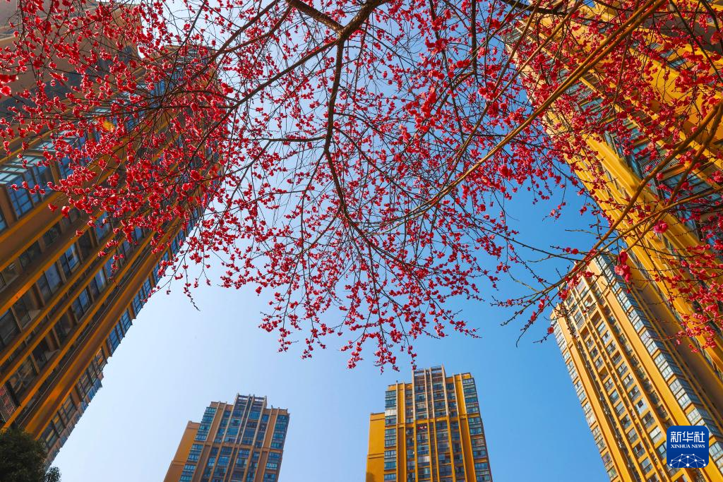 1月13日拍摄的梅花掩映重庆市黔江区伴山国际小区建筑。新华社发(杨敏摄)