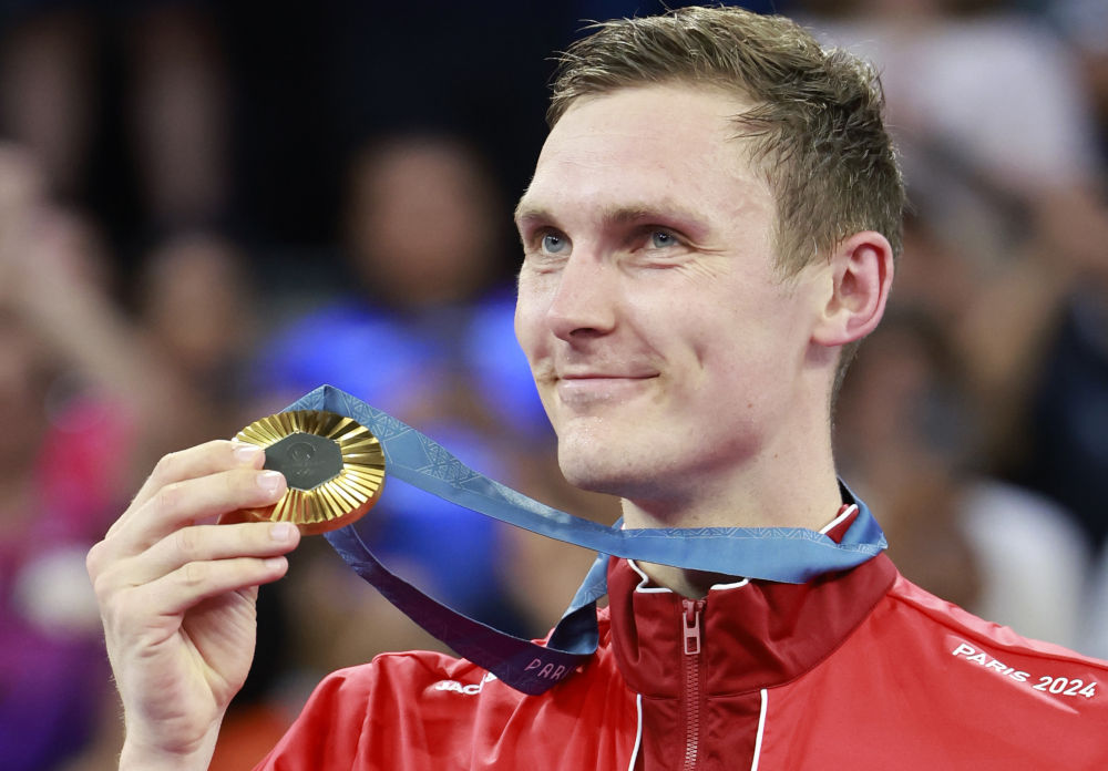 2024年8月5日,在巴黎奥运会羽毛球项目男单决赛中,丹麦选手安赛龙夺得冠军。新华社记者 任正来 摄